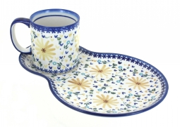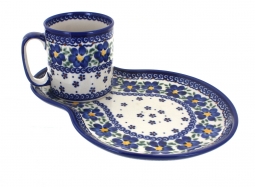 Start your mornings in style with this breakfast plate and matching mug set, thoughtfully designed for both beauty and convenience. The 11.25-inch by 8-inch plate features a special resting place for the mug, while leaving plenty of space for toast, fruit, or pastries. The 12 oz mug is perfectly sized for coffee, tea, or cocoa, and together the set creates a charming and functional breakfast duo. Each piece is handmade and hand-painted in Poland by skilled artisans, showcasing vibrant patterns and timeless craftsmanship that make every set unique.