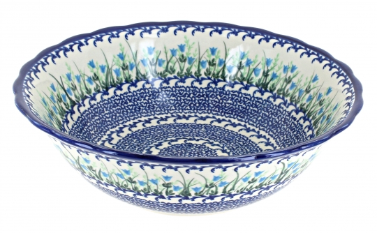Serve in style with this large scalloped serving bowl, a beautifully crafted piece that blends function with timeless elegance. Measuring 10" in diameter and 3" deep, it’s the perfect size for salads, pasta dishes, vegetables, or fruit, making it a versatile addition to both everyday meals and special gatherings. The graceful scalloped edge adds a touch of sophistication, creating an eye-catching presentation that transitions seamlessly from kitchen to table. Each bowl is handmade and hand-painted in Poland, featuring bold, vibrant patterns that ensure every piece is truly one of a kind.