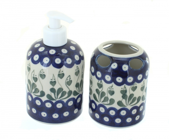 Elevate your powder room or en suite with this beautifully coordinated soap dispenser and toothbrush holder set, available in your favorite Polish pottery patterns. Handcrafted and hand-painted by skilled artisans, each piece showcases the vibrant colors and intricate details that make Polish pottery so distinctive, ensuring your set is both functional and decorative. The soap dispenser stands 6 inches high, making it a perfect size for hand soap, dish soap, or even lotion, while the toothbrush holder measures 4 inches high, keeping brushes neatly organized and within easy reach.