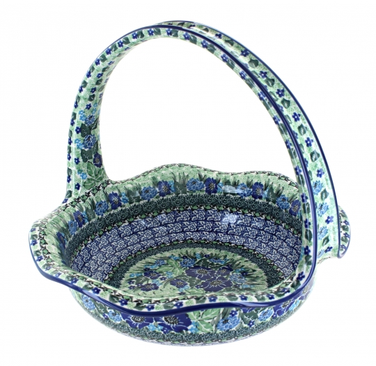 Both stunning and multi-purpose, this round basket from Ceramika Artystyczna is a beautiful example of Polish pottery craftsmanship. Handmade and hand-painted, each basket showcases the artistry and tradition that make these pieces collectible and unique. Measuring 11 inches in diameter and 10 inches high, it is generously sized for a variety of uses while maintaining an elegant, decorative presence.