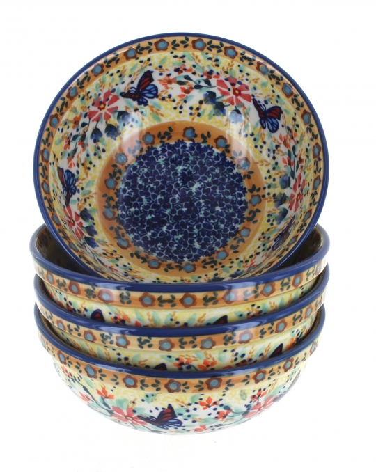 Bring charm, color, and function to your table with this 4-piece dessert bowl set, thoughtfully designed for both everyday meals and special occasions. Each bowl measures 5.75 inches in diameter and 2.25 inches deep, making them the perfect size for desserts like ice cream, fruit, or pudding, as well as small portions of soup, dips, or snacks. Every bowl is individually handmade and hand-painted in Poland, carrying on the centuries-old tradition of Polish Pottery.
