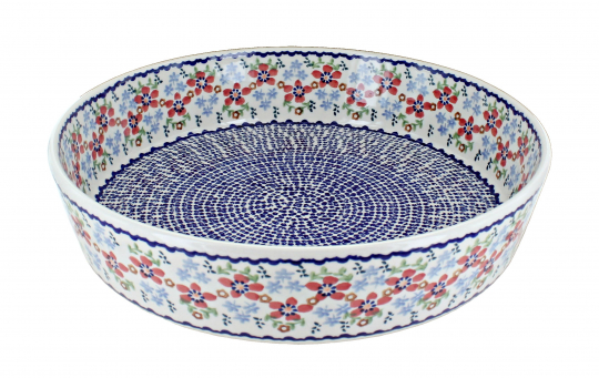 Serve up something special with this large round baking dish, a versatile piece designed for both sweet and savory favorites. Measuring 11.25" in diameter and 3" deep, it’s generously sized for family casseroles, baked pasta, roasted vegetables, or decadent desserts like crisps and cobblers. The round shape provides even heat distribution and an elegant presentation, making it as functional as it is beautiful. Each dish is handmade and hand-painted in Poland, showcasing vibrant, detailed patterns that transform everyday bakeware into a true work of art.