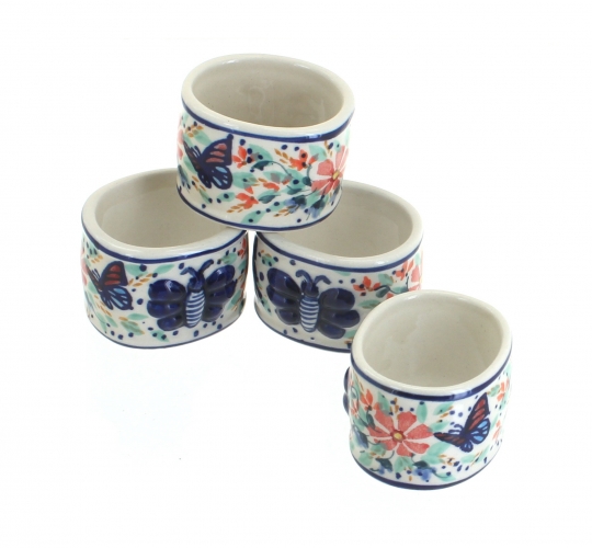 Elevate your table setting with this set of four ceramic napkin rings, each carefully handmade and hand-painted in Poland. Measuring 1.75 inches in diameter, they are perfectly sized to hold cloth or paper napkins, keeping your table neat while adding a touch of artistry and color. Every piece features unique, vibrant designs that coordinate beautifully with our extensive dinnerware collection, allowing you to create a cohesive look or mix and match patterns for a more eclectic style.