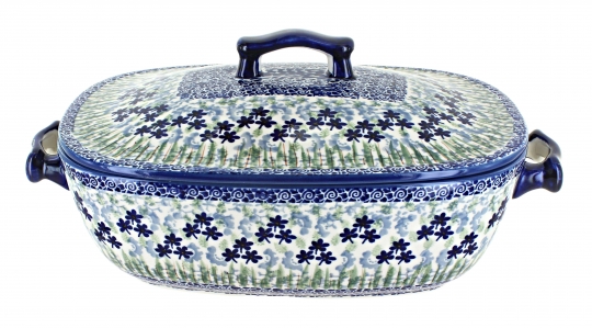 Serve your favorite recipes in style with this versatile covered roaster, a piece that blends everyday function with timeless artistry. Measuring 10.5" long x 8" wide x 3.25" high; 2.75" deep. Thoughtfully designed with sturdy handles on the sides and a secure handle on top, this roaster is easy to lift, carry, and serve directly from oven to table. The fitted lid helps lock in moisture and flavor, ensuring evenly cooked meals that stay warm longer. Each roaster is handmade and hand-painted in Poland, decorated with vibrant, traditional patterns that make every piece a unique work of art.